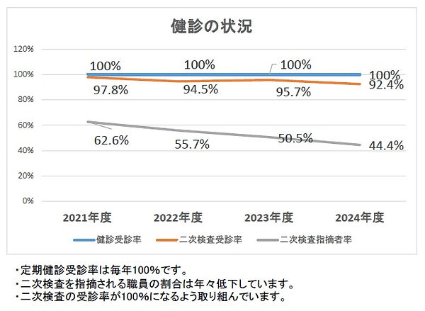 二次検査を指摘された職員に対し保健師による受診勧奨を行いました。職員で構成される衛生チームを中心に受診に繋げるサポートや受診結果の把握を行い、職員の健康意識向上に努めています。